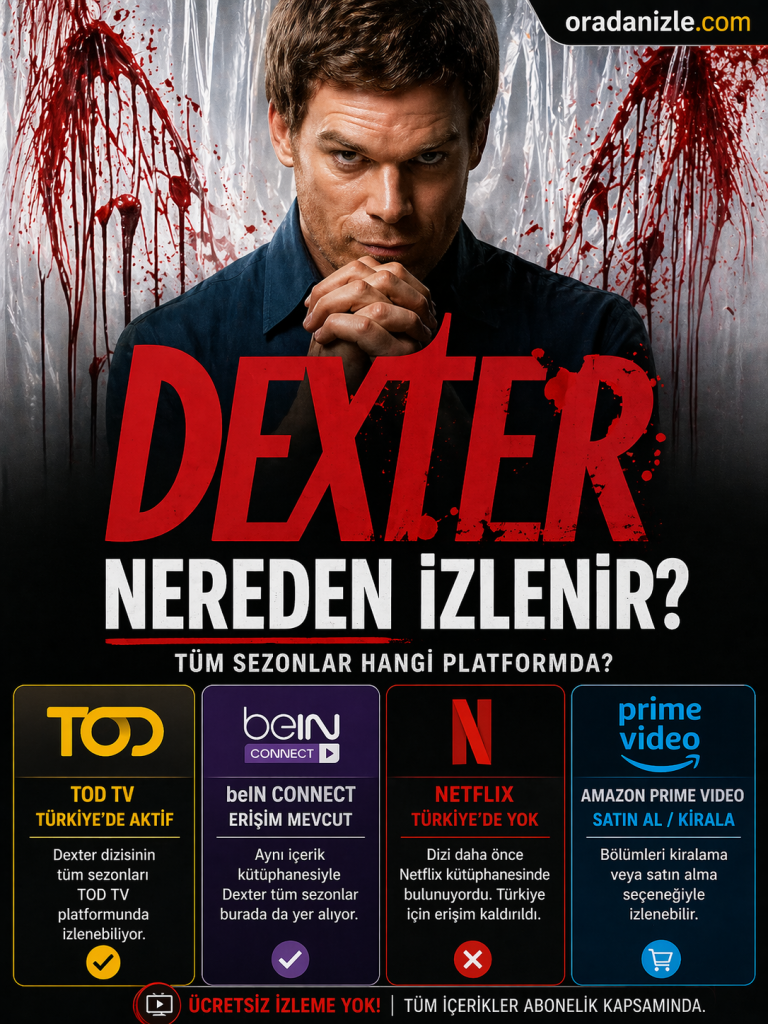 Dexter izlemek isteyenler için ana platform TOD TV olarak öne çıkıyor. Dizinin tüm sezonları tek platform üzerinden izlenebiliyor. Bölümler sıralı şekilde sunuluyor. İzleme deneyimi kesintisiz ilerliyor.
