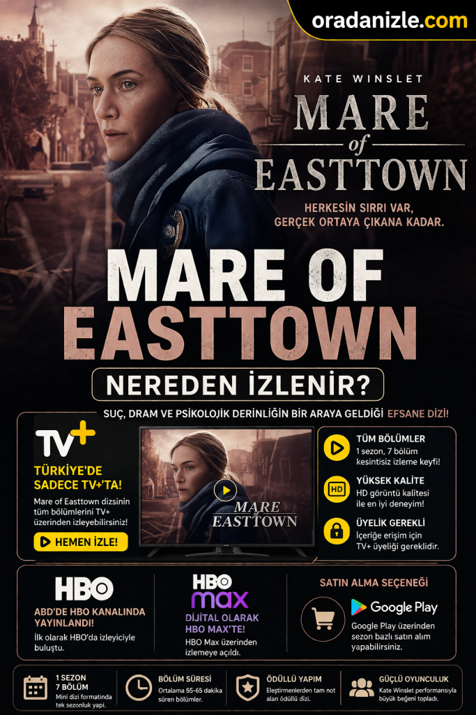 Mare of Easttown izlemek isteyenler için ana adres TV+ olarak öne çıkıyor. Platform üzerinde mini serinin tüm bölümleri sıralı şekilde sunuluyor. İzleme tek ekran üzerinden ilerliyor.